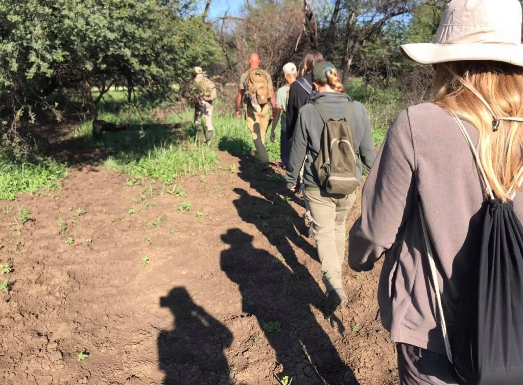 We immediately found and followed tracks from two white rhinos. The hot sun beat down on us as we remained quiet in a single file line while following the spoor. To our surprise we walked into a black rhino. The wind was in our favor so we grouped together hiding behind a bush and slowly backed off undetected.