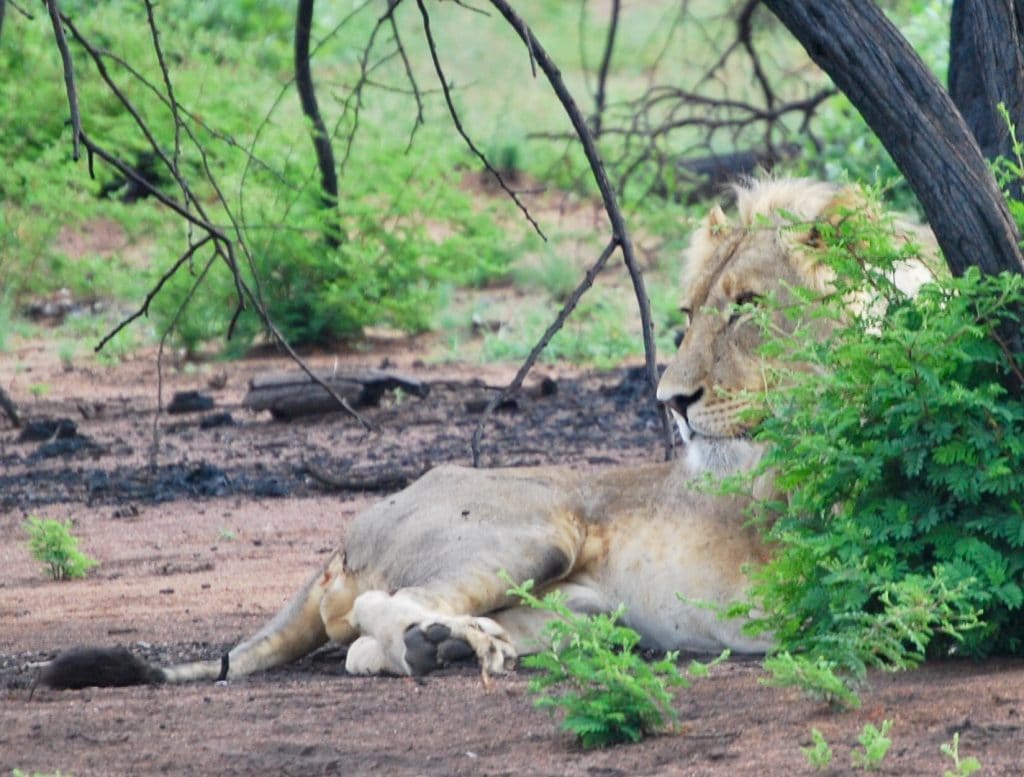 So far we’ve been lucky enough to see three out of the Big 5 but we really wanted to see the lions that we heard roaring that morning. We passed up on fresh elephant dung and tracks in our pursuit. It was a gamble but we took our chances. We drove a ways before parking and using our senses and wind direction and followed lion tracks to two lions.