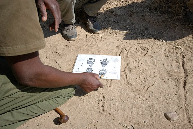 I was privileged to spend several hours with Jason van Zyl whose knowledge of tracks and signs was an eye-opener to me. Here he is busy checking out tracks before setting out markers for the students